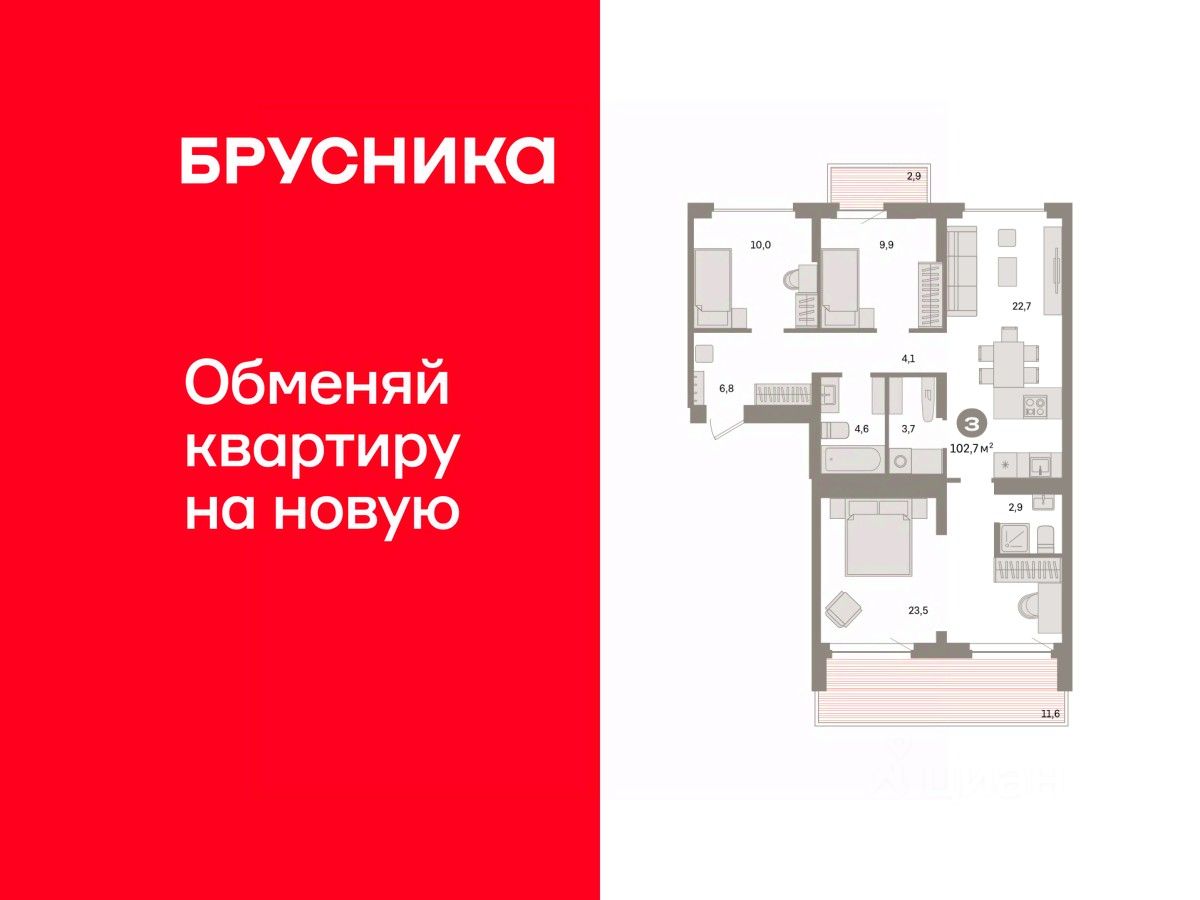 Квартира с кухней-гостиной и тремя спальнями в квартале "Депо". Особенности планировки: балкон, окна на две стороны, предчистовая отделка, разнесённые спальни, терраса на крыше.