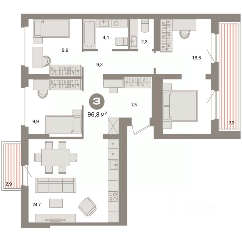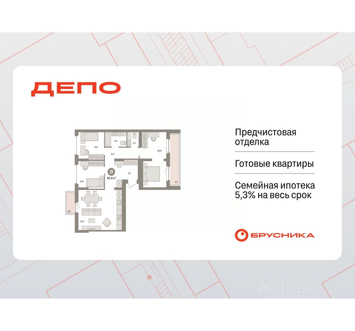 Квартира с кухней-гостиной и тремя спальнями в квартале "Депо". Особенности планировки: окна на две стороны, второй санузел, вид во двор, разнесённые спальни, предчистовая отделка, балкон, терраса на крыше.