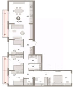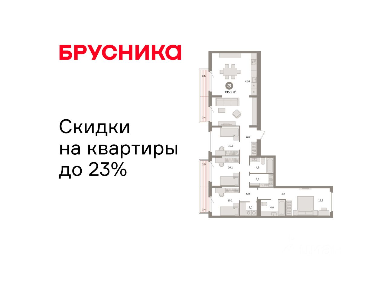 Квартира с кухней-гостиной и четырьмя спальнями в квартале "Депо". Особенности планировки: балкон, вид во двор, гардеробная, ипотека 10%, окна на две стороны, постирочная, предчистовая отделка, разнесённые спальни.