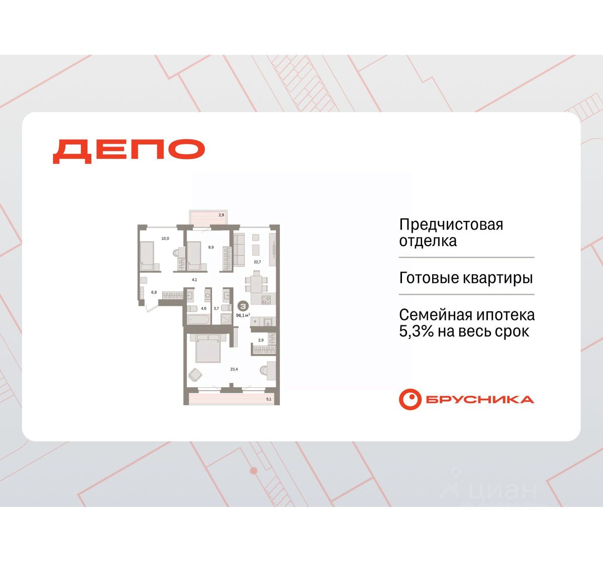 Квартира с кухней-гостиной и тремя спальнями в квартале "Депо". Особенности планировки: окна на две стороны, второй санузел, гардеробная, вид во двор, разнесённые спальни, предчистовая отделка, балкон, терраса на крыше.