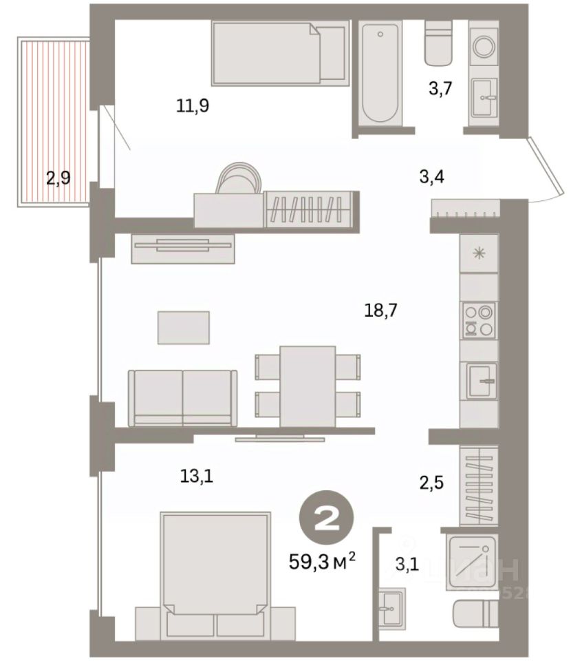 Квартира с кухней-гостиной и двумя спальнями в квартале "Депо". Особенности планировки: второй санузел, гардеробная, разнесённые спальни, предчистовая отделка, мастер-спальня, балкон.