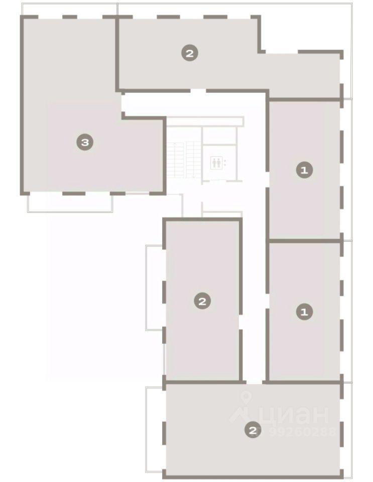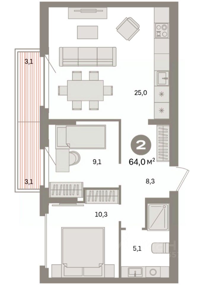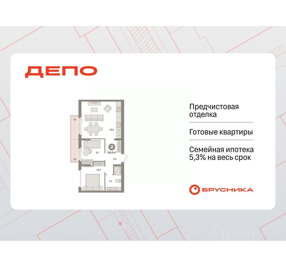 Квартира с кухней-гостиной и двумя спальнями в квартале "Депо". Особенности планировки: разнесённые спальни, предчистовая отделка, балкон.