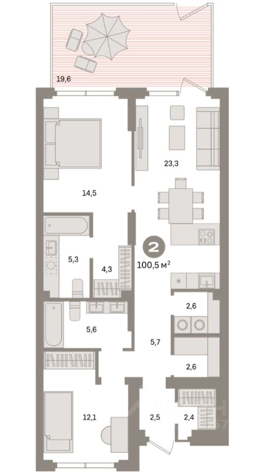 Квартира с кухней-гостиной и двумя спальнями в квартале "Депо". Особенности планировки: окна на две стороны, второй санузел, гардеробная, вид во двор, отдельный вход, разнесённые спальни, предчистовая отделка, мастер-спальня, терраса, постирочная.