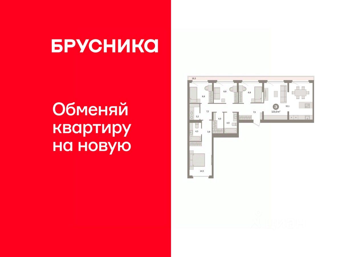 Квартира с кухней-гостиной и четырьмя спальнями в квартале "Депо". Особенности планировки: окна на две стороны, предчистовая отделка, рабочий кабинет, разнесённые спальни, терраса на крыше.