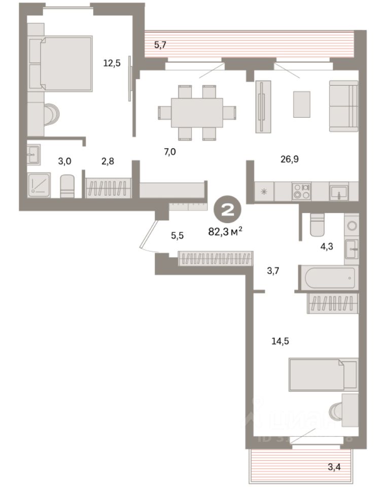 Квартира с кухней-гостиной и двумя спальнями в квартале "Депо". Особенности планировки: окна на две стороны, второй санузел, гардеробная, разнесённые спальни, предчистовая отделка, мастер-спальня, балкон, терраса на крыше.