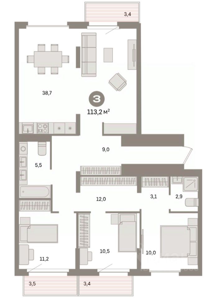 Квартира с кухней-гостиной и тремя спальнями в квартале "Депо". Особенности планировки: второй санузел, гардеробная, разнесённые спальни, предчистовая отделка, мастер-спальня, балкон.