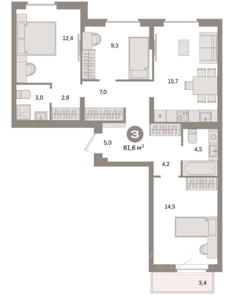 Квартира с кухней-гостиной и тремя спальнями в квартале "Депо". Особенности планировки: окна на две стороны, второй санузел, гардеробная, разнесённые спальни, предчистовая отделка, мастер-спальня, балкон.