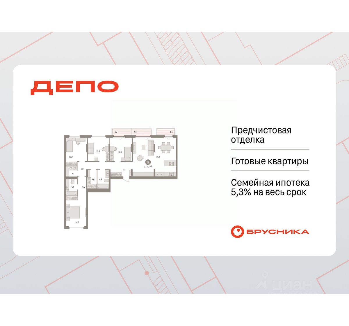 Квартира с кухней-гостиной и четырьмя спальнями в квартале "Депо". Особенности планировки: гардеробная, рабочий кабинет, вид во двор, разнесённые спальни, предчистовая отделка, постирочная, балкон.