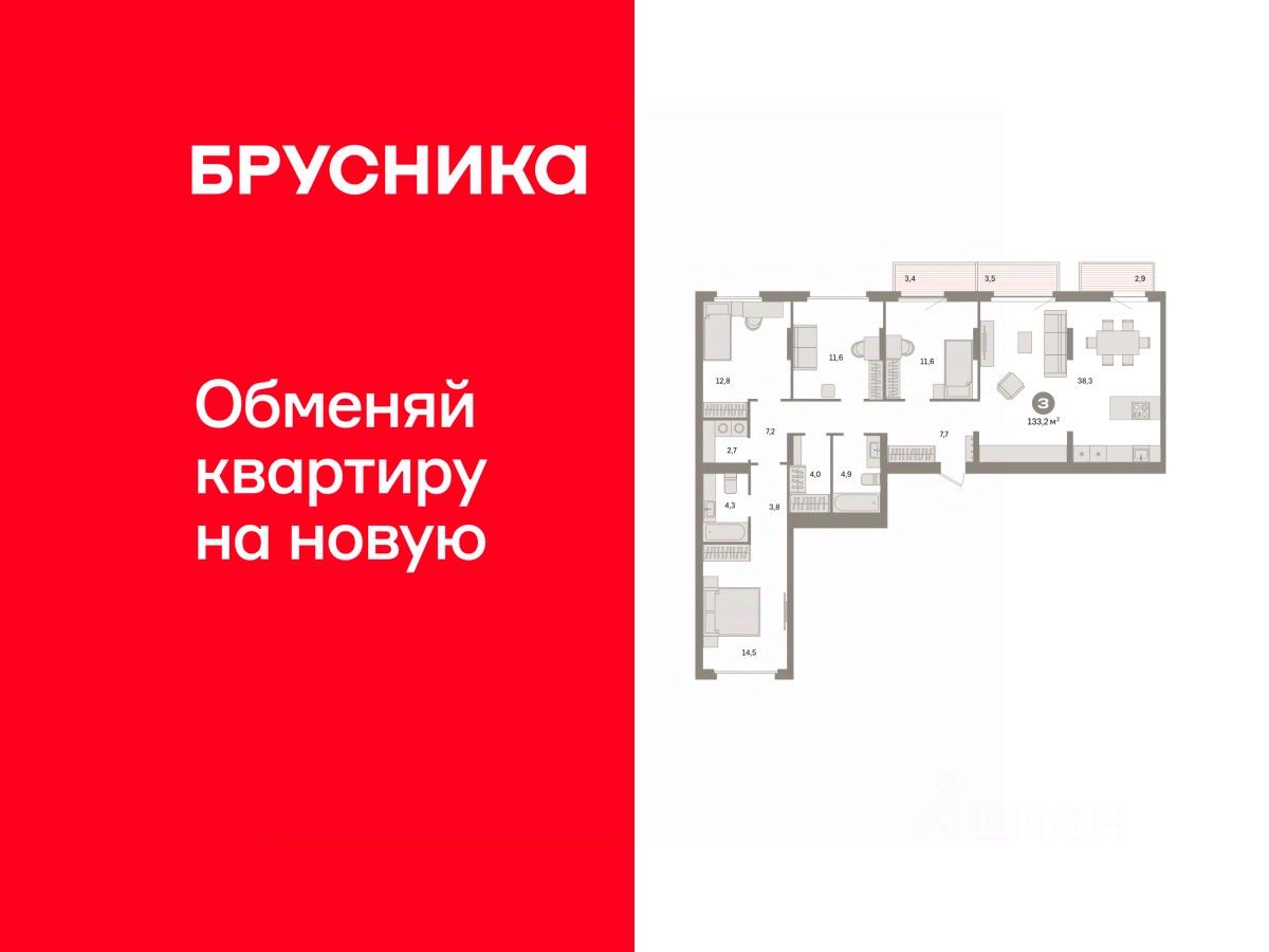 Квартира с кухней-гостиной и четырьмя спальнями в квартале "Депо". Особенности планировки: балкон, окна на две стороны, предчистовая отделка, рабочий кабинет, разнесённые спальни.