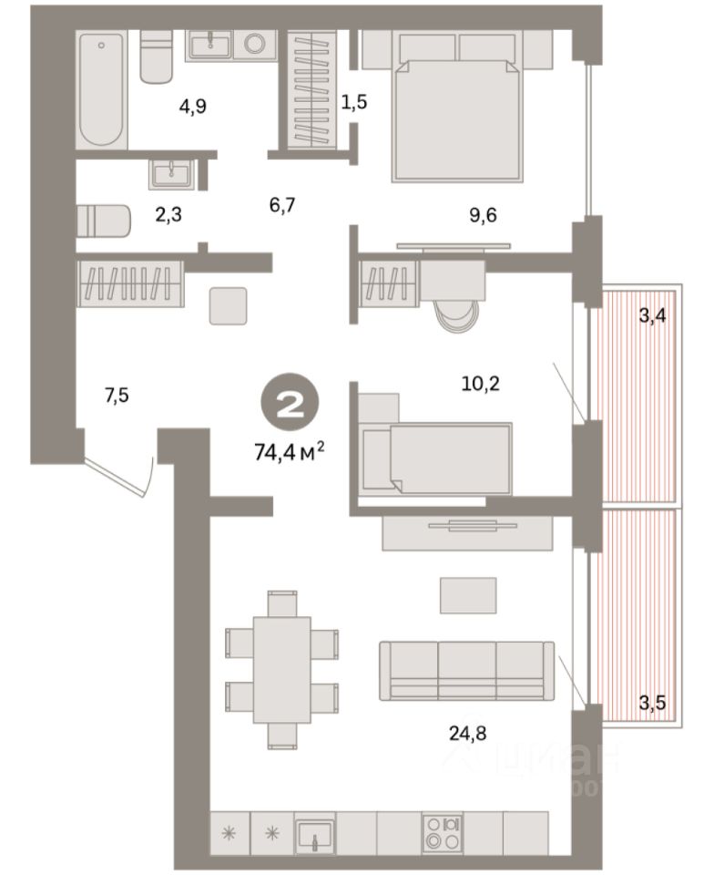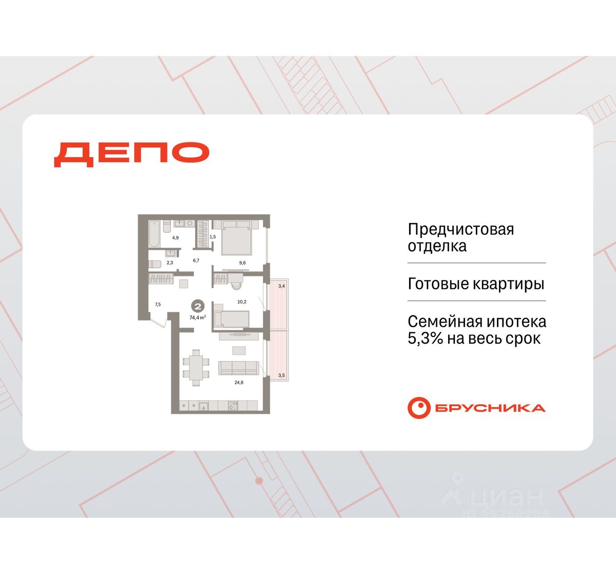Квартира с кухней-гостиной и двумя спальнями в квартале "Депо". Особенности планировки: второй санузел, гардеробная, разнесённые спальни, предчистовая отделка, балкон.