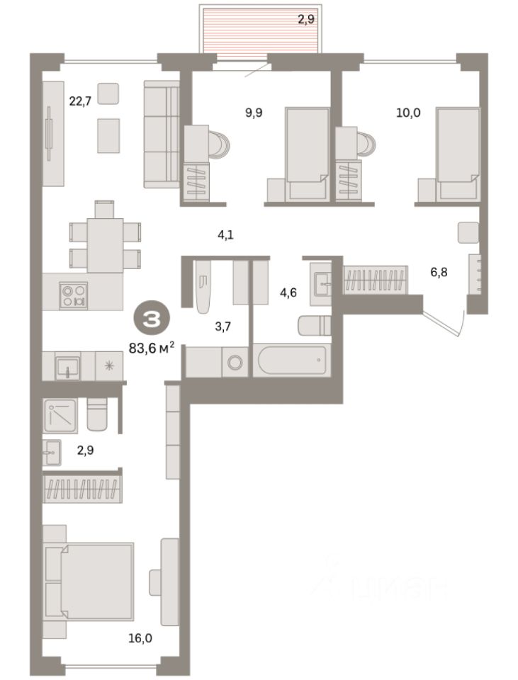 Квартира с кухней-гостиной и тремя спальнями в квартале "Депо". Особенности планировки: второй санузел, вид во двор, разнесённые спальни, предчистовая отделка, мастер-спальня, постирочная, балкон.