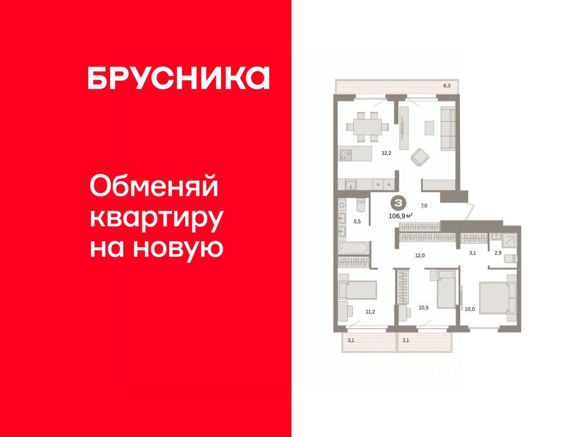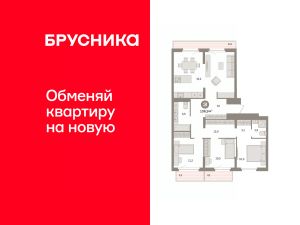 Квартира с кухней-гостиной и тремя спальнями в квартале "Депо". Особенности планировки: балкон, окна на две стороны, предчистовая отделка, разнесённые спальни, терраса на крыше.