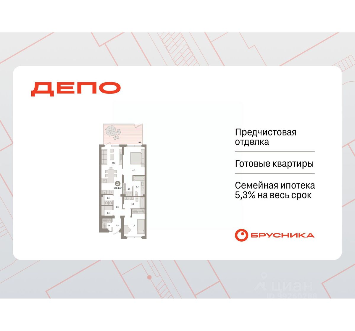 Квартира с кухней-гостиной и двумя спальнями в квартале "Депо". Особенности планировки: окна на две стороны, гардеробная, вид во двор, отдельный вход, разнесённые спальни, предчистовая отделка, мастер-спальня, терраса, постирочная.
