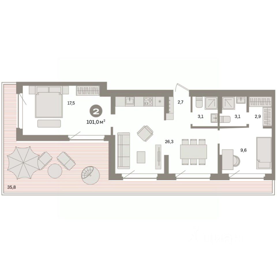 Квартира с кухней-гостиной и двумя спальнями в квартале "Депо". Особенности планировки: второй санузел, гардеробная, разнесённые спальни, предчистовая отделка, мастер-спальня, терраса на крыше.