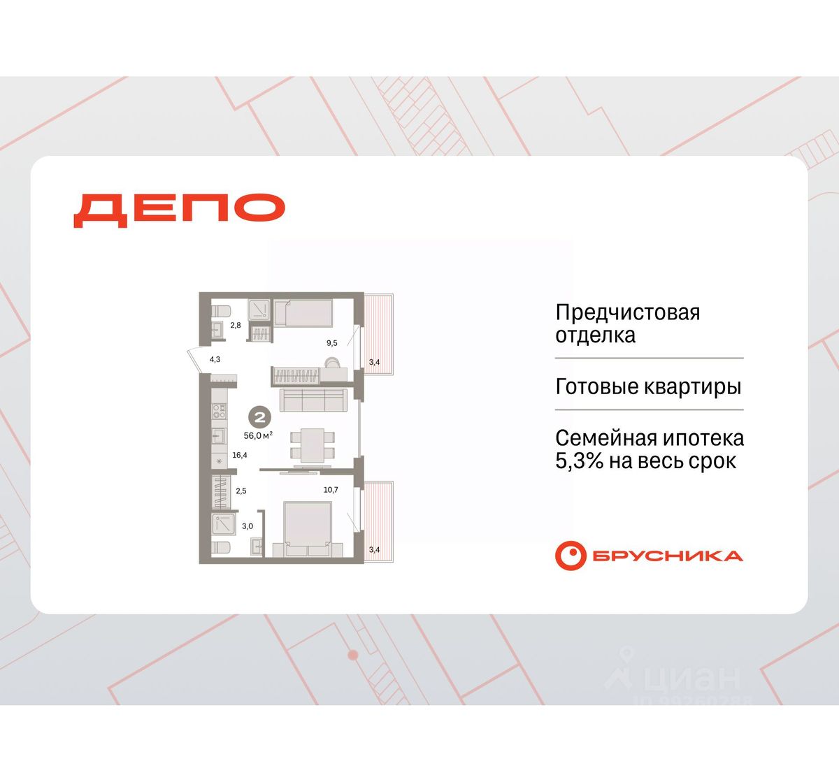 Квартира с кухней-гостиной и двумя спальнями в квартале "Депо". Особенности планировки: второй санузел, гардеробная, вид во двор, разнесённые спальни, предчистовая отделка, мастер-спальня, балкон.