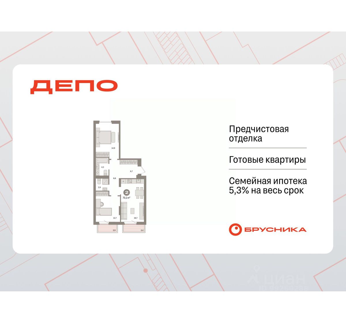 Квартира с кухней-гостиной и двумя спальнями в квартале "Депо". Особенности планировки: окна на две стороны, второй санузел, вид во двор, разнесённые спальни, предчистовая отделка, балкон.