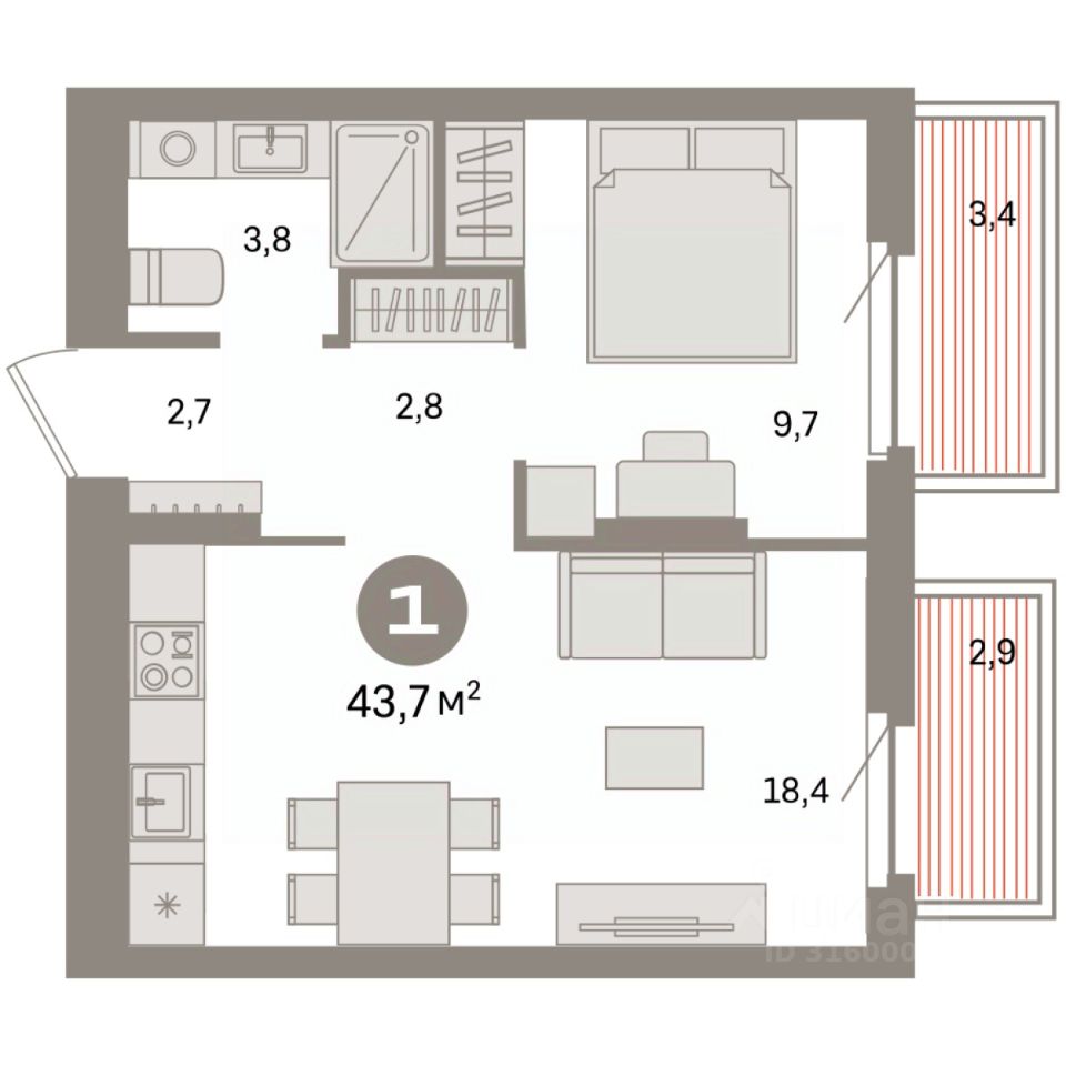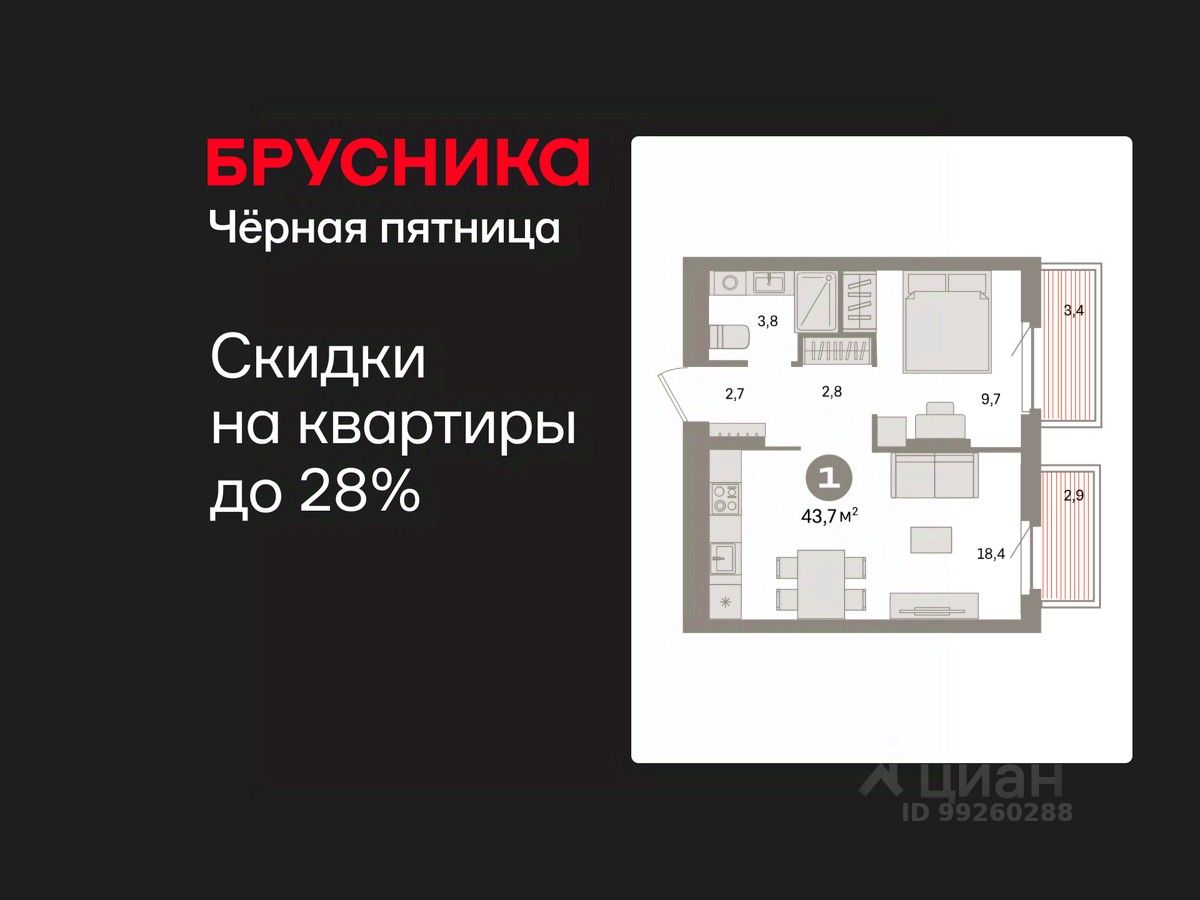Квартира с кухней-гостиной и одной спальней в квартале "Депо". Особенности планировки: предчистовая отделка, балкон.