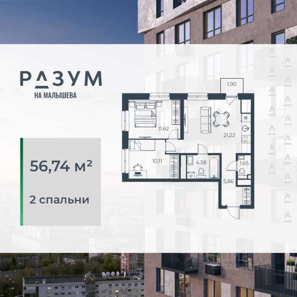 "РАЗУМ на Малышева" — новый проект от федерального девелопера с 12-летним опытом. Квартал расположен в самом сердце Екатеринбурга в Кировском районе. В шаговой доступности: 8 детских садов; 7 школ; прогулочные зоны и парки; магазины; учреждения профессионального образования. "РАЗУМ на Малышева" — это четыре 31-этажных башен на улице Малышева. Дополнительная приватность, безопасность и тишина создаётся за счёт возвышения домов на стилобате. Балконы на фасадах открывают виды на город и во двор, а угловые террасы открывают ещё больше простора и потрясающих видов. Жители квартала "РАЗУМ на Малышева" наслаждаются зелёными зонами круглый год. 60% территории занимает озеленение с деревьями, кустарниками и многолетниками. Здесь прогулки, отдых, работа и встречи с друзьями проходят в уютных зонах с перголами, шезлонгами и гамаками. "РАЗУМ на Малышева" — это: развитая инфраструктура; эргономичные и яркие архитектурные решения; дополнительный уровень спокойствия за счет возвышения на стилобате; во дворе высажены деревья и кустарники с учетом 4 сезонов; многоуровневое освещение; благоустройство; высокий уровень безопасности; стильные гранд-лобби и ресепшн; особые панорамные виды; собственная управляющая компания; собственный детский сад на 150 мест; четырёхэтажный паркинг; соседский центр место развития добрососедства; коммерческие помещения. Эргономичность и удобство в каждом квадратном метре — основа планировочных решений в квартале "РАЗУМ на Малышева". Для каждого сценария жизни найдется планировка: представлены десятки вариантов от 29,92 м² до 84,88 м². Квартиры с террасами размещены на верхних этажах домов. Терраса — это дополнительное пространство для слияния с природой.