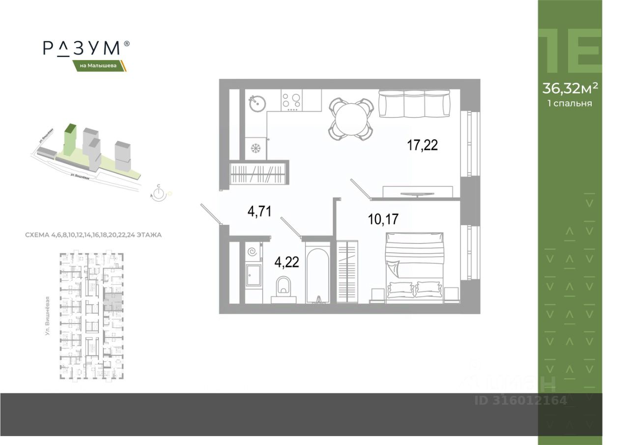 "РАЗУМ на Малышева" — новый проект от федерального девелопера с 12-летним опытом. Квартал расположен в самом сердце Екатеринбурга в Кировском районе. В шаговой доступности: 8 детских садов; 7 школ; прогулочные зоны и парки; магазины; учреждения профессионального образования. "РАЗУМ на Малышева" — это четыре 31-этажных башен на улице Малышева. Дополнительная приватность, безопасность и тишина создаётся за счёт возвышения домов на стилобате. Балконы на фасадах открывают виды на город и во двор, а угловые террасы открывают ещё больше простора и потрясающих видов. Жители квартала "РАЗУМ на Малышева" наслаждаются зелёными зонами круглый год. 60% территории занимает озеленение с деревьями, кустарниками и многолетниками. Здесь прогулки, отдых, работа и встречи с друзьями проходят в уютных зонах с перголами, шезлонгами и гамаками. "РАЗУМ на Малышева" — это: развитая инфраструктура; эргономичные и яркие архитектурные решения; дополнительный уровень спокойствия за счет возвышения на стилобате; во дворе высажены деревья и кустарники с учетом 4 сезонов; многоуровневое освещение; благоустройство; высокий уровень безопасности; стильные гранд-лобби и ресепшн; особые панорамные виды; собственная управляющая компания; собственный детский сад на 150 мест; четырёхэтажный паркинг; соседский центр место развития добрососедства; коммерческие помещения. Эргономичность и удобство в каждом квадратном метре — основа планировочных решений в квартале "РАЗУМ на Малышева". Для каждого сценария жизни найдется планировка: представлены десятки вариантов от 29,92 м² до 84,88 м². Квартиры с террасами размещены на верхних этажах домов. Терраса — это дополнительное пространство для слияния с природой.