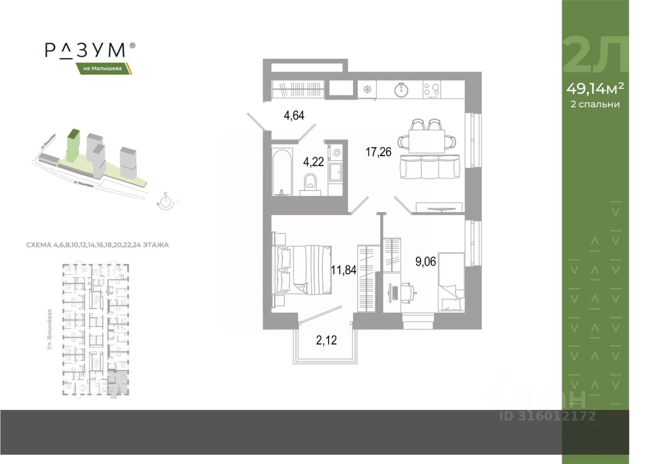 "РАЗУМ на Малышева" — новый проект от федерального девелопера с 12-летним опытом. Квартал расположен в самом сердце Екатеринбурга в Кировском районе. В шаговой доступности: 8 детских садов; 7 школ; прогулочные зоны и парки; магазины; учреждения профессионального образования. "РАЗУМ на Малышева" — это четыре 31-этажных башен на улице Малышева. Дополнительная приватность, безопасность и тишина создаётся за счёт возвышения домов на стилобате. Балконы на фасадах открывают виды на город и во двор, а угловые террасы открывают ещё больше простора и потрясающих видов. Жители квартала "РАЗУМ на Малышева" наслаждаются зелёными зонами круглый год. 60% территории занимает озеленение с деревьями, кустарниками и многолетниками. Здесь прогулки, отдых, работа и встречи с друзьями проходят в уютных зонах с перголами, шезлонгами и гамаками. "РАЗУМ на Малышева" — это: развитая инфраструктура; эргономичные и яркие архитектурные решения; дополнительный уровень спокойствия за счет возвышения на стилобате; во дворе высажены деревья и кустарники с учетом 4 сезонов; многоуровневое освещение; благоустройство; высокий уровень безопасности; стильные гранд-лобби и ресепшн; особые панорамные виды; собственная управляющая компания; собственный детский сад на 150 мест; четырёхэтажный паркинг; соседский центр место развития добрососедства; коммерческие помещения. Эргономичность и удобство в каждом квадратном метре — основа планировочных решений в квартале "РАЗУМ на Малышева". Для каждого сценария жизни найдется планировка: представлены десятки вариантов от 29,92 м² до 84,88 м². Квартиры с террасами размещены на верхних этажах домов. Терраса — это дополнительное пространство для слияния с природой.