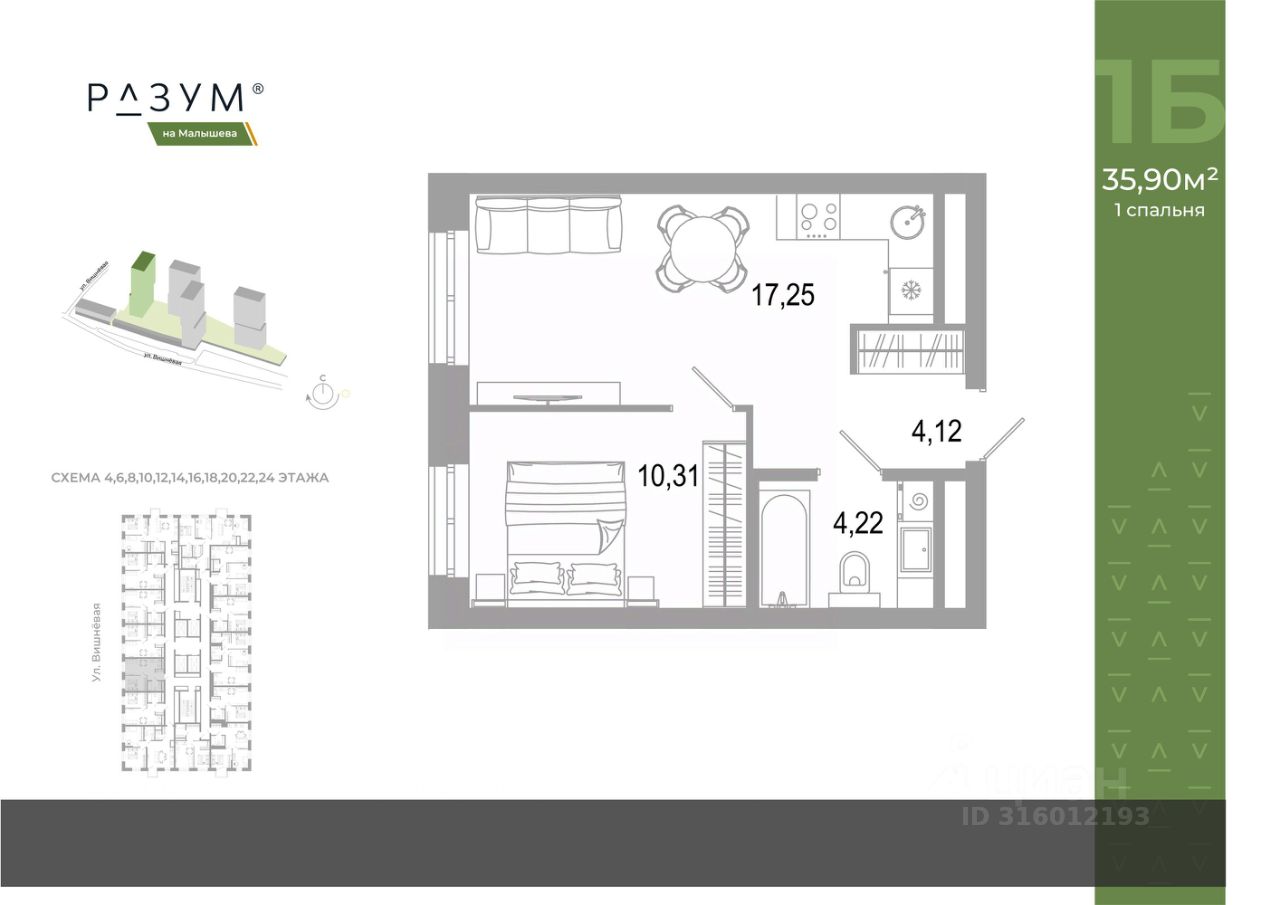 "РАЗУМ на Малышева" — новый проект от федерального девелопера с 12-летним опытом. Квартал расположен в самом сердце Екатеринбурга в Кировском районе. В шаговой доступности: 8 детских садов; 7 школ; прогулочные зоны и парки; магазины; учреждения профессионального образования. "РАЗУМ на Малышева" — это четыре 31-этажных башен на улице Малышева. Дополнительная приватность, безопасность и тишина создаётся за счёт возвышения домов на стилобате. Балконы на фасадах открывают виды на город и во двор, а угловые террасы открывают ещё больше простора и потрясающих видов. Жители квартала "РАЗУМ на Малышева" наслаждаются зелёными зонами круглый год. 60% территории занимает озеленение с деревьями, кустарниками и многолетниками. Здесь прогулки, отдых, работа и встречи с друзьями проходят в уютных зонах с перголами, шезлонгами и гамаками. "РАЗУМ на Малышева" — это: развитая инфраструктура; эргономичные и яркие архитектурные решения; дополнительный уровень спокойствия за счет возвышения на стилобате; во дворе высажены деревья и кустарники с учетом 4 сезонов; многоуровневое освещение; благоустройство; высокий уровень безопасности; стильные гранд-лобби и ресепшн; особые панорамные виды; собственная управляющая компания; собственный детский сад на 150 мест; четырёхэтажный паркинг; соседский центр место развития добрососедства; коммерческие помещения. Эргономичность и удобство в каждом квадратном метре — основа планировочных решений в квартале "РАЗУМ на Малышева". Для каждого сценария жизни найдется планировка: представлены десятки вариантов от 29,92 м² до 84,88 м². Квартиры с террасами размещены на верхних этажах домов. Терраса — это дополнительное пространство для слияния с природой.