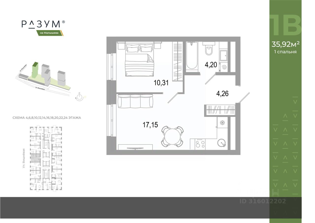 "РАЗУМ на Малышева" — новый проект от федерального девелопера с 12-летним опытом. Квартал расположен в самом сердце Екатеринбурга в Кировском районе. В шаговой доступности: 8 детских садов; 7 школ; прогулочные зоны и парки; магазины; учреждения профессионального образования. "РАЗУМ на Малышева" — это четыре 31-этажных башен на улице Малышева. Дополнительная приватность, безопасность и тишина создаётся за счёт возвышения домов на стилобате. Балконы на фасадах открывают виды на город и во двор, а угловые террасы открывают ещё больше простора и потрясающих видов. Жители квартала "РАЗУМ на Малышева" наслаждаются зелёными зонами круглый год. 60% территории занимает озеленение с деревьями, кустарниками и многолетниками. Здесь прогулки, отдых, работа и встречи с друзьями проходят в уютных зонах с перголами, шезлонгами и гамаками. "РАЗУМ на Малышева" — это: развитая инфраструктура; эргономичные и яркие архитектурные решения; дополнительный уровень спокойствия за счет возвышения на стилобате; во дворе высажены деревья и кустарники с учетом 4 сезонов; многоуровневое освещение; благоустройство; высокий уровень безопасности; стильные гранд-лобби и ресепшн; особые панорамные виды; собственная управляющая компания; собственный детский сад на 150 мест; четырёхэтажный паркинг; соседский центр место развития добрососедства; коммерческие помещения. Эргономичность и удобство в каждом квадратном метре — основа планировочных решений в квартале "РАЗУМ на Малышева". Для каждого сценария жизни найдется планировка: представлены десятки вариантов от 29,92 м² до 84,88 м². Квартиры с террасами размещены на верхних этажах домов. Терраса — это дополнительное пространство для слияния с природой.