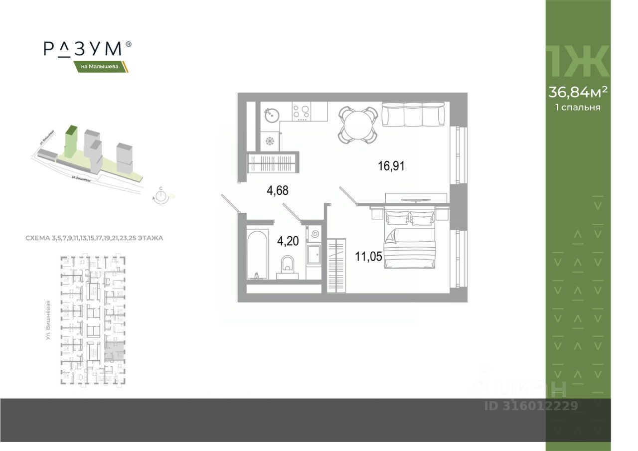 "РАЗУМ на Малышева" — новый проект от федерального девелопера с 12-летним опытом. Квартал расположен в самом сердце Екатеринбурга в Кировском районе. В шаговой доступности: 8 детских садов; 7 школ; прогулочные зоны и парки; магазины; учреждения профессионального образования. "РАЗУМ на Малышева" — это четыре 31-этажных башен на улице Малышева. Дополнительная приватность, безопасность и тишина создаётся за счёт возвышения домов на стилобате. Балконы на фасадах открывают виды на город и во двор, а угловые террасы открывают ещё больше простора и потрясающих видов. Жители квартала "РАЗУМ на Малышева" наслаждаются зелёными зонами круглый год. 60% территории занимает озеленение с деревьями, кустарниками и многолетниками. Здесь прогулки, отдых, работа и встречи с друзьями проходят в уютных зонах с перголами, шезлонгами и гамаками. "РАЗУМ на Малышева" — это: развитая инфраструктура; эргономичные и яркие архитектурные решения; дополнительный уровень спокойствия за счет возвышения на стилобате; во дворе высажены деревья и кустарники с учетом 4 сезонов; многоуровневое освещение; благоустройство; высокий уровень безопасности; стильные гранд-лобби и ресепшн; особые панорамные виды; собственная управляющая компания; собственный детский сад на 150 мест; четырёхэтажный паркинг; соседский центр место развития добрососедства; коммерческие помещения. Эргономичность и удобство в каждом квадратном метре — основа планировочных решений в квартале "РАЗУМ на Малышева". Для каждого сценария жизни найдется планировка: представлены десятки вариантов от 29,92 м² до 84,88 м². Квартиры с террасами размещены на верхних этажах домов. Терраса — это дополнительное пространство для слияния с природой.