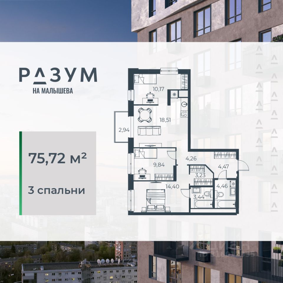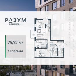 "РАЗУМ на Малышева" — новый проект от федерального девелопера с 12-летним опытом. Квартал расположен в самом сердце Екатеринбурга в Кировском районе. В шаговой доступности: 8 детских садов; 7 школ; прогулочные зоны и парки; магазины; учреждения профессионального образования. "РАЗУМ на Малышева" — это четыре 31-этажных башен на улице Малышева. Дополнительная приватность, безопасность и тишина создаётся за счёт возвышения домов на стилобате. Балконы на фасадах открывают виды на город и во двор, а угловые террасы открывают ещё больше простора и потрясающих видов. Жители квартала "РАЗУМ на Малышева" наслаждаются зелёными зонами круглый год. 60% территории занимает озеленение с деревьями, кустарниками и многолетниками. Здесь прогулки, отдых, работа и встречи с друзьями проходят в уютных зонах с перголами, шезлонгами и гамаками. "РАЗУМ на Малышева" — это: развитая инфраструктура; эргономичные и яркие архитектурные решения; дополнительный уровень спокойствия за счет возвышения на стилобате; во дворе высажены деревья и кустарники с учетом 4 сезонов; многоуровневое освещение; благоустройство; высокий уровень безопасности; стильные гранд-лобби и ресепшн; особые панорамные виды; собственная управляющая компания; собственный детский сад на 150 мест; четырёхэтажный паркинг; соседский центр место развития добрососедства; коммерческие помещения. Эргономичность и удобство в каждом квадратном метре — основа планировочных решений в квартале "РАЗУМ на Малышева". Для каждого сценария жизни найдется планировка: представлены десятки вариантов от 29,92 м² до 84,88 м². Квартиры с террасами размещены на верхних этажах домов. Терраса — это дополнительное пространство для слияния с природой.