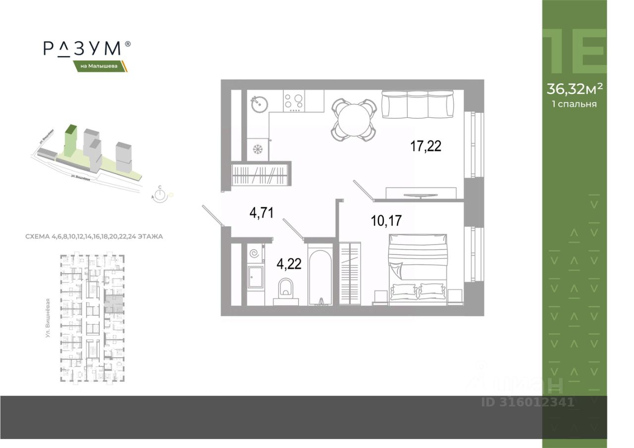 "РАЗУМ на Малышева" — новый проект от федерального девелопера с 12-летним опытом. Квартал расположен в самом сердце Екатеринбурга в Кировском районе. В шаговой доступности: 8 детских садов; 7 школ; прогулочные зоны и парки; магазины; учреждения профессионального образования. "РАЗУМ на Малышева" — это четыре 31-этажных башен на улице Малышева. Дополнительная приватность, безопасность и тишина создаётся за счёт возвышения домов на стилобате. Балконы на фасадах открывают виды на город и во двор, а угловые террасы открывают ещё больше простора и потрясающих видов. Жители квартала "РАЗУМ на Малышева" наслаждаются зелёными зонами круглый год. 60% территории занимает озеленение с деревьями, кустарниками и многолетниками. Здесь прогулки, отдых, работа и встречи с друзьями проходят в уютных зонах с перголами, шезлонгами и гамаками. "РАЗУМ на Малышева" — это: развитая инфраструктура; эргономичные и яркие архитектурные решения; дополнительный уровень спокойствия за счет возвышения на стилобате; во дворе высажены деревья и кустарники с учетом 4 сезонов; многоуровневое освещение; благоустройство; высокий уровень безопасности; стильные гранд-лобби и ресепшн; особые панорамные виды; собственная управляющая компания; собственный детский сад на 150 мест; четырёхэтажный паркинг; соседский центр место развития добрососедства; коммерческие помещения. Эргономичность и удобство в каждом квадратном метре — основа планировочных решений в квартале "РАЗУМ на Малышева". Для каждого сценария жизни найдется планировка: представлены десятки вариантов от 29,92 м² до 84,88 м². Квартиры с террасами размещены на верхних этажах домов. Терраса — это дополнительное пространство для слияния с природой.