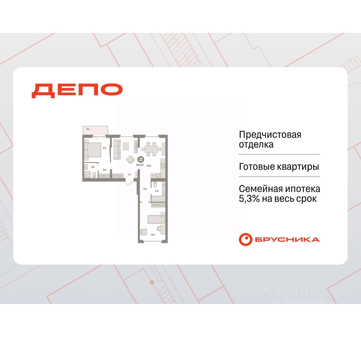 Квартира с кухней-гостиной и двумя спальнями в квартале "Депо". Особенности планировки: балкон, вид во двор, второй санузел, гардеробная, мастер-спальня, окна на две стороны, предчистовая отделка, разнесённые спальни.