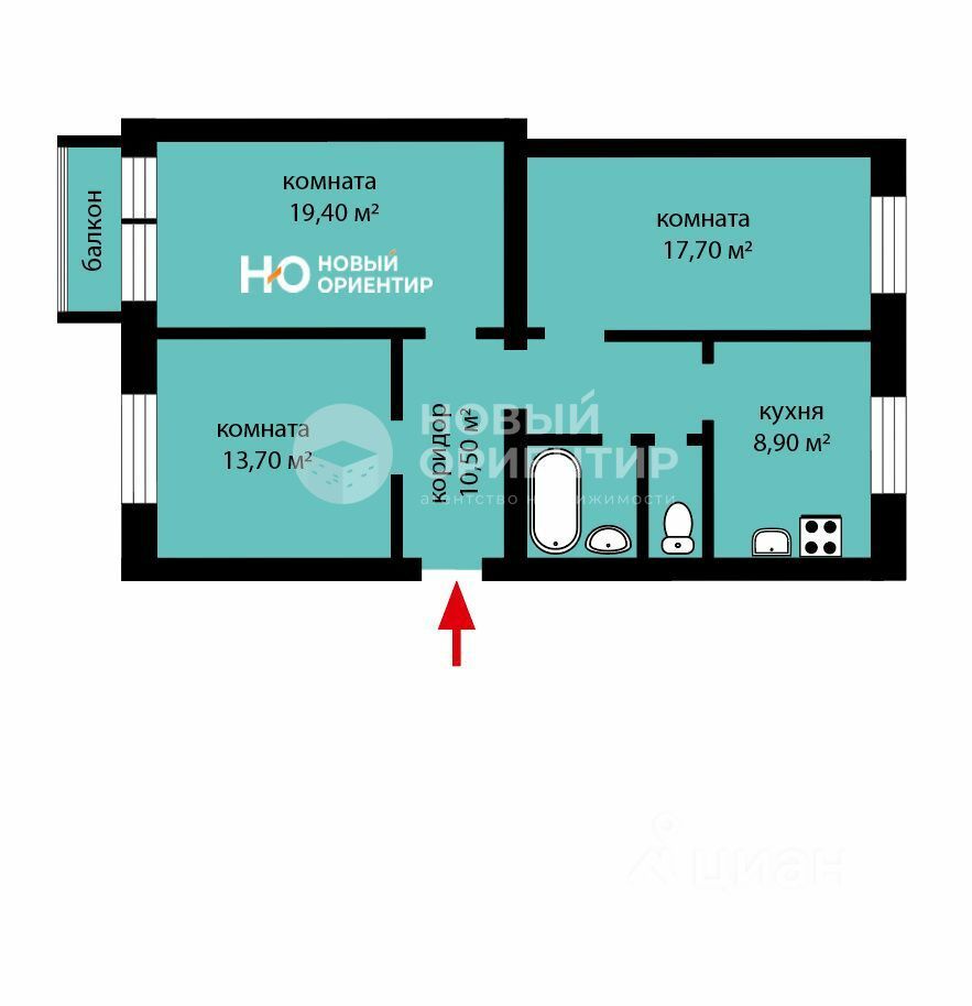 Жилая площадь: 52,8 м (комнаты: 19.4 + 17.7 + 13,3 м)