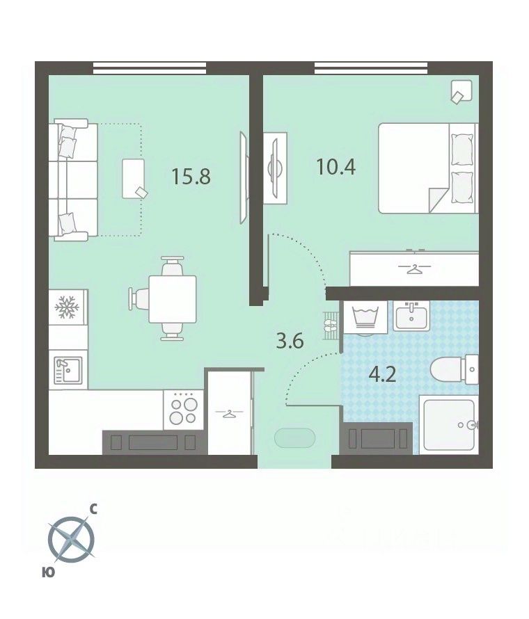 Жилая площадь 10.4 м2, кухня 15.8 м2, чистовая отделка. Раздельных санузлов - нет, балконов - нет, лоджий - нет.