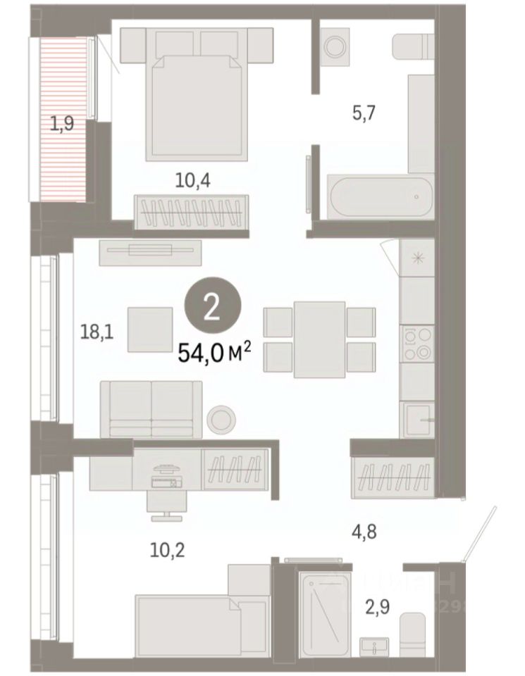 Квартира с кухней-гостиной и двумя спальнями в районе Шишимская горка. Особенности планировки: лоджия, разнесённые спальни, предчистовая отделка, мастер-спальня.