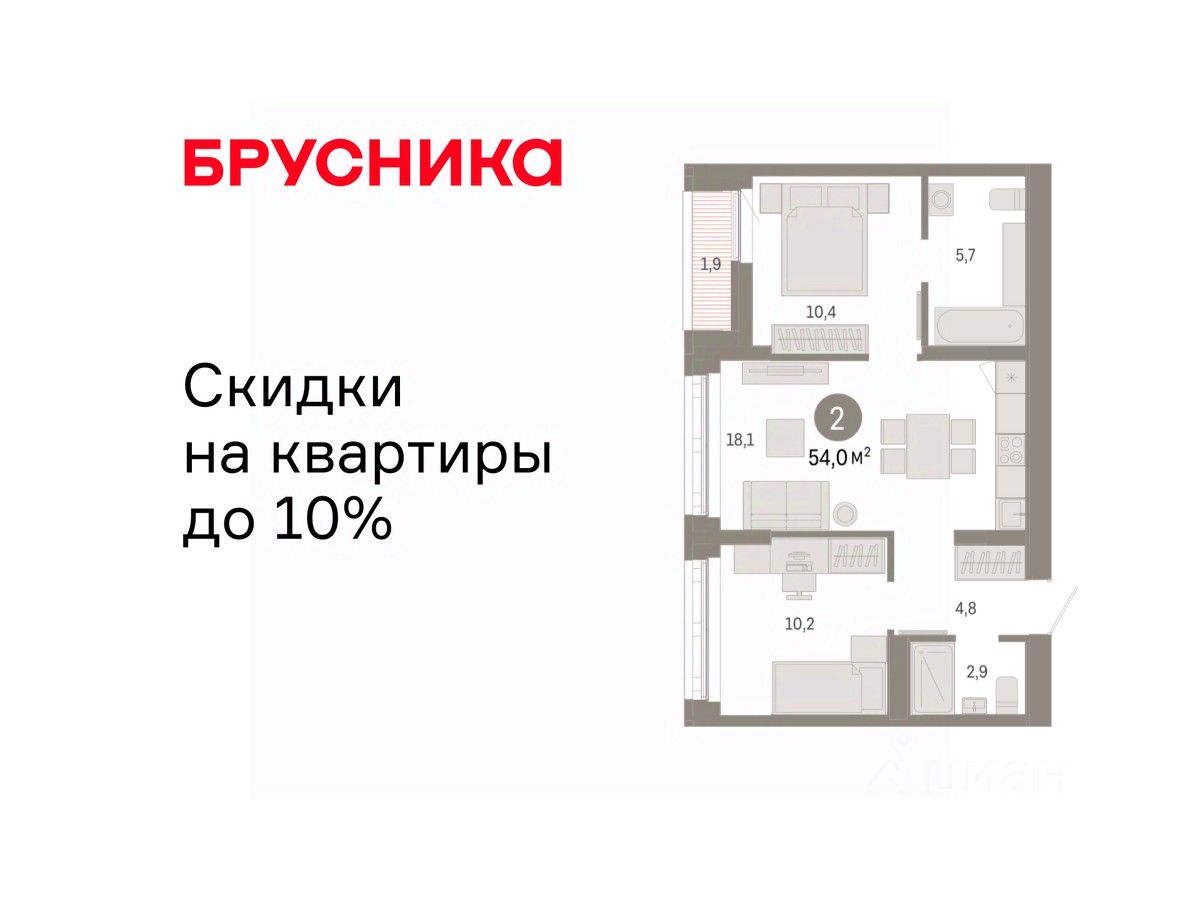Квартира с кухней-гостиной и двумя спальнями в районе Шишимская горка. Особенности планировки: предчистовая отделка, разнесённые спальни.