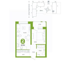 Квартира разработана с акцентом на удобство и практичность. Спальня создает атмосферу для спокойного отдыха, а ванная комната оснащена всеми необходимыми удобствами. Благодаря большим окнам все помещения хорошо освещены и идеально подходят для расстановки мебели. Планировка кухни позволяет эффективно зонировать пространство.