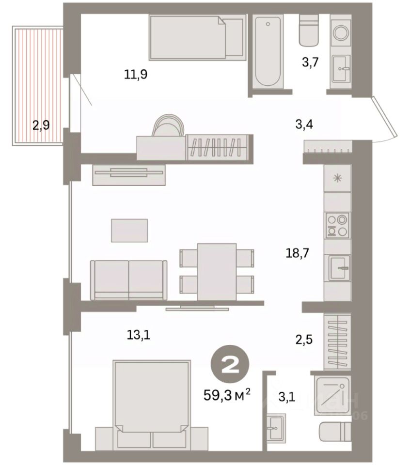 Квартира с кухней-гостиной и двумя спальнями в квартале "Депо". Особенности планировки: второй санузел, гардеробная, разнесённые спальни, предчистовая отделка, мастер-спальня, балкон.