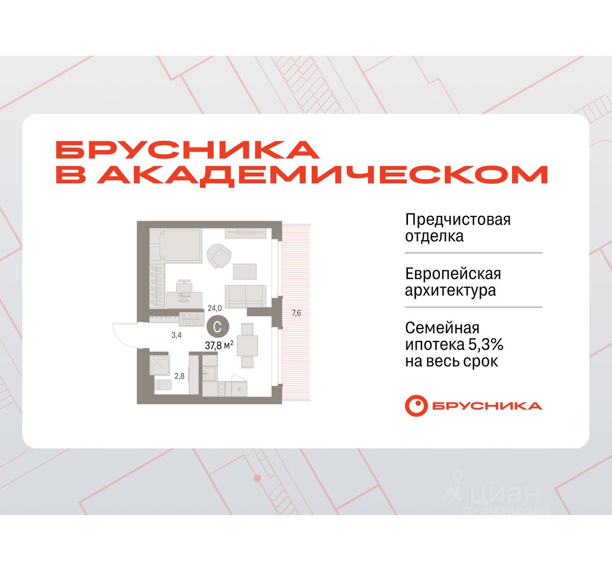 Студия в Бруснике в Академическом. Особенности планировки: предчистовая отделка, терраса на крыше.