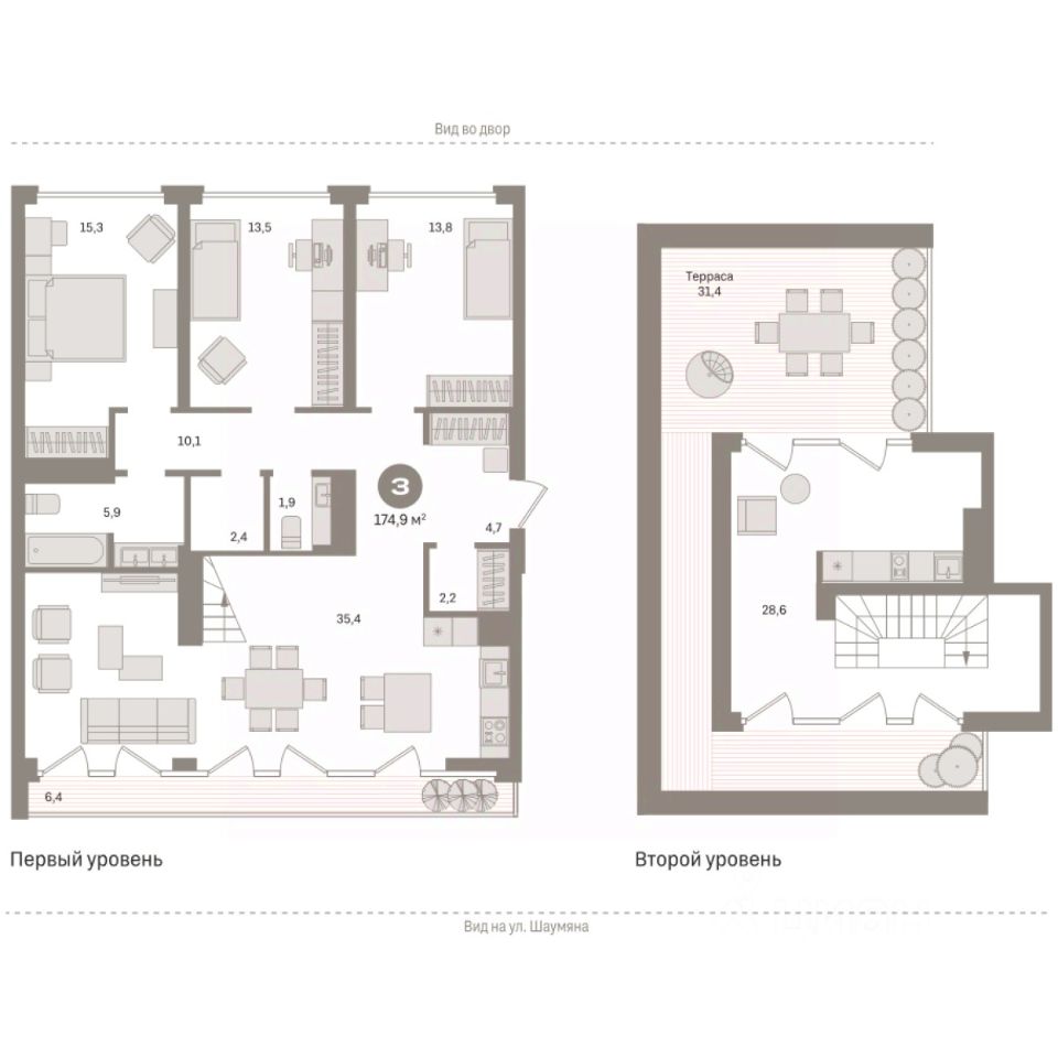 Квартира с кухней-гостиной и тремя спальнями в Южных кварталах. Особенности планировки: окна на две стороны, второй санузел, гардеробная, без отделки, двухуровневая, вид во двор, постирочная, терраса на крыше.