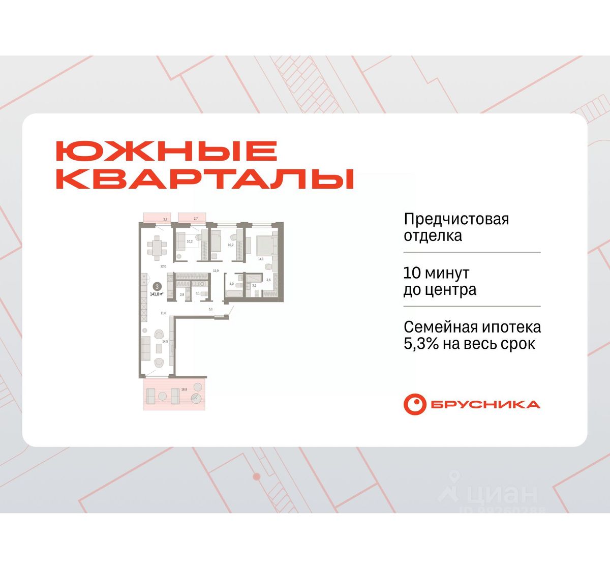Квартира с кухней-гостиной и тремя спальнями в Южных кварталах. Особенности планировки: окна на две стороны, второй санузел, гардеробная, рабочий кабинет, вид во двор, предчистовая отделка, мастер-спальня, терраса, балкон.