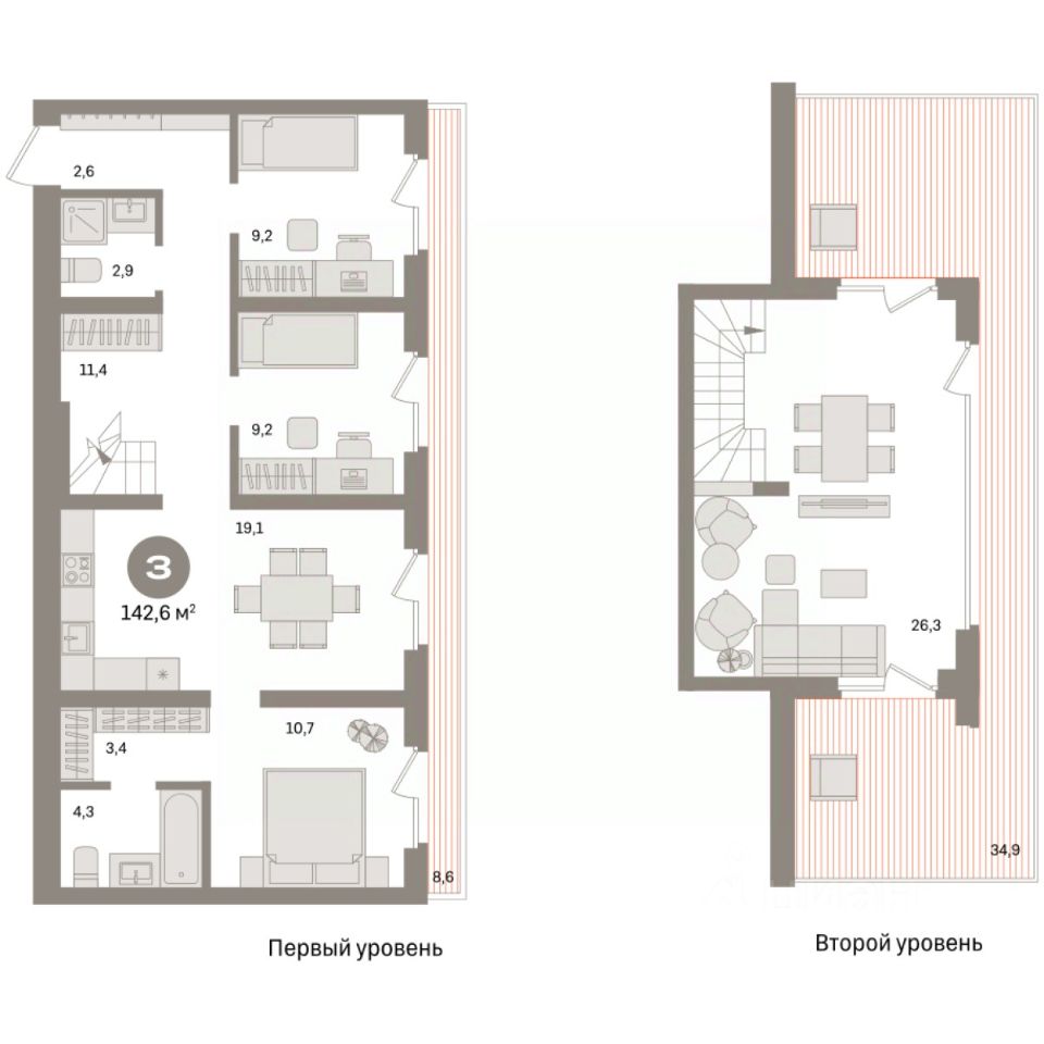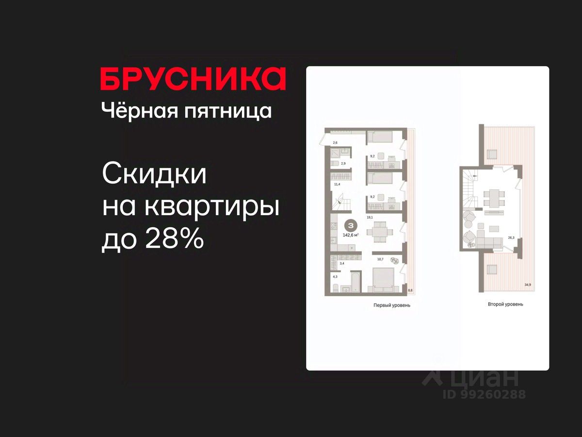 Двухуровневая квартира с кухней-гостиной и тремя спальнями в Южных кварталах. Особенности планировки: гардеробная, двухуровневая, разнесённые спальни, предчистовая отделка, мастер-спальня, терраса на крыше.