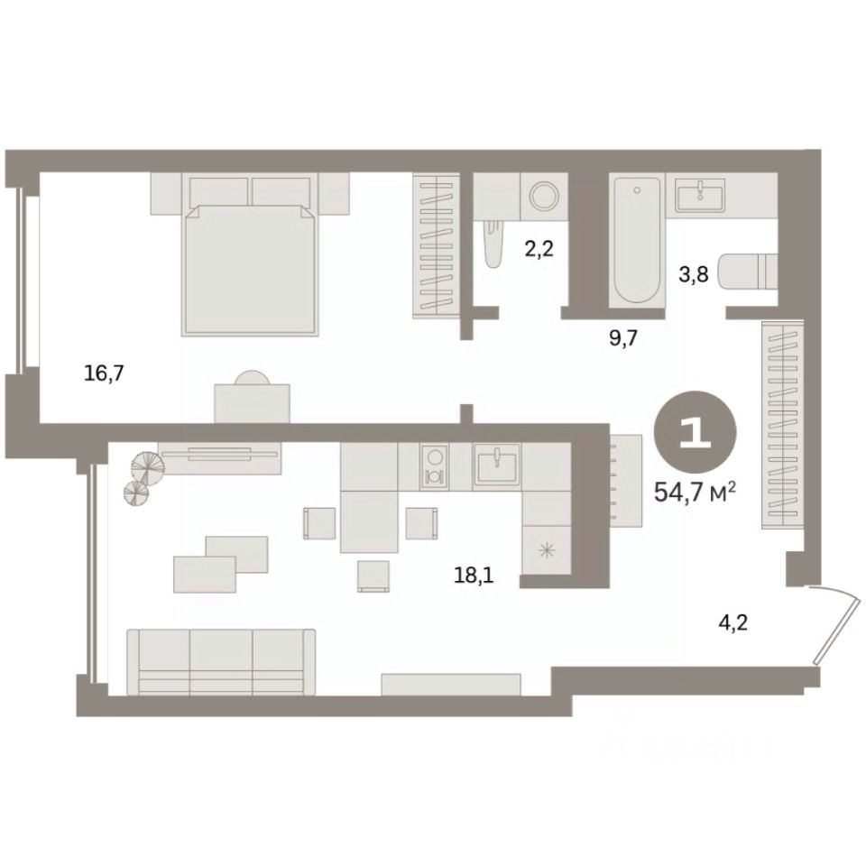 Квартира с кухней-гостиной и одной спальней в Южных кварталах. Особенности планировки: вид во двор, предчистовая отделка, постирочная.