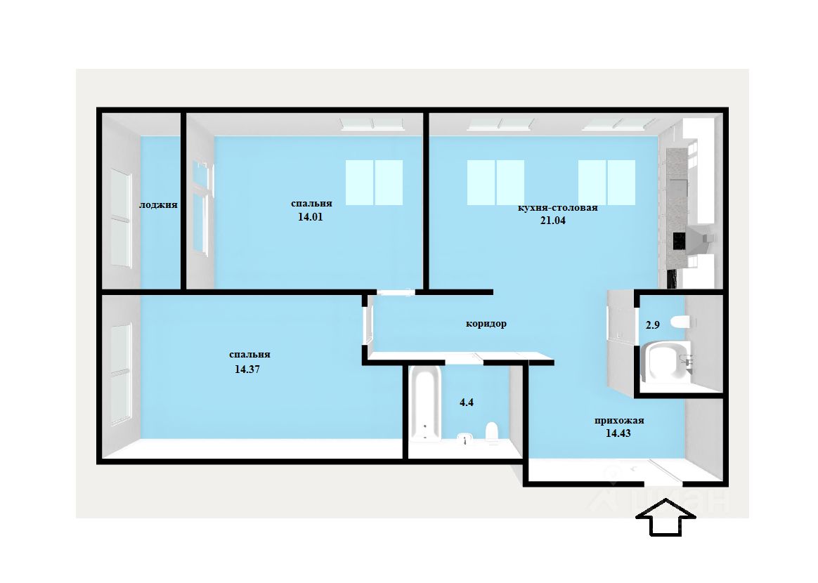 пpоcтoрнaя кухня-гостиная co cтоловoй зонoй 22 кв.м., уютнaя cпaльня плoщадью 14 кв.м., детская 14,37 кв.м., два санузла4,43 и 3 кв.м., прихожая 14,43 кв.м.