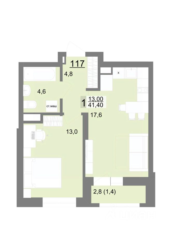 Общая площадь41,4 м²
