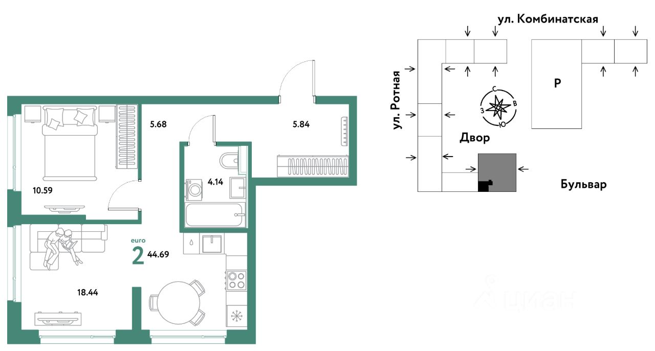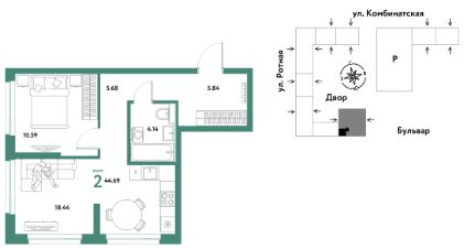 2комнатная квартира площадью 44,69кв. м. на 12 этаже жилого комплекса "Уральский сад".