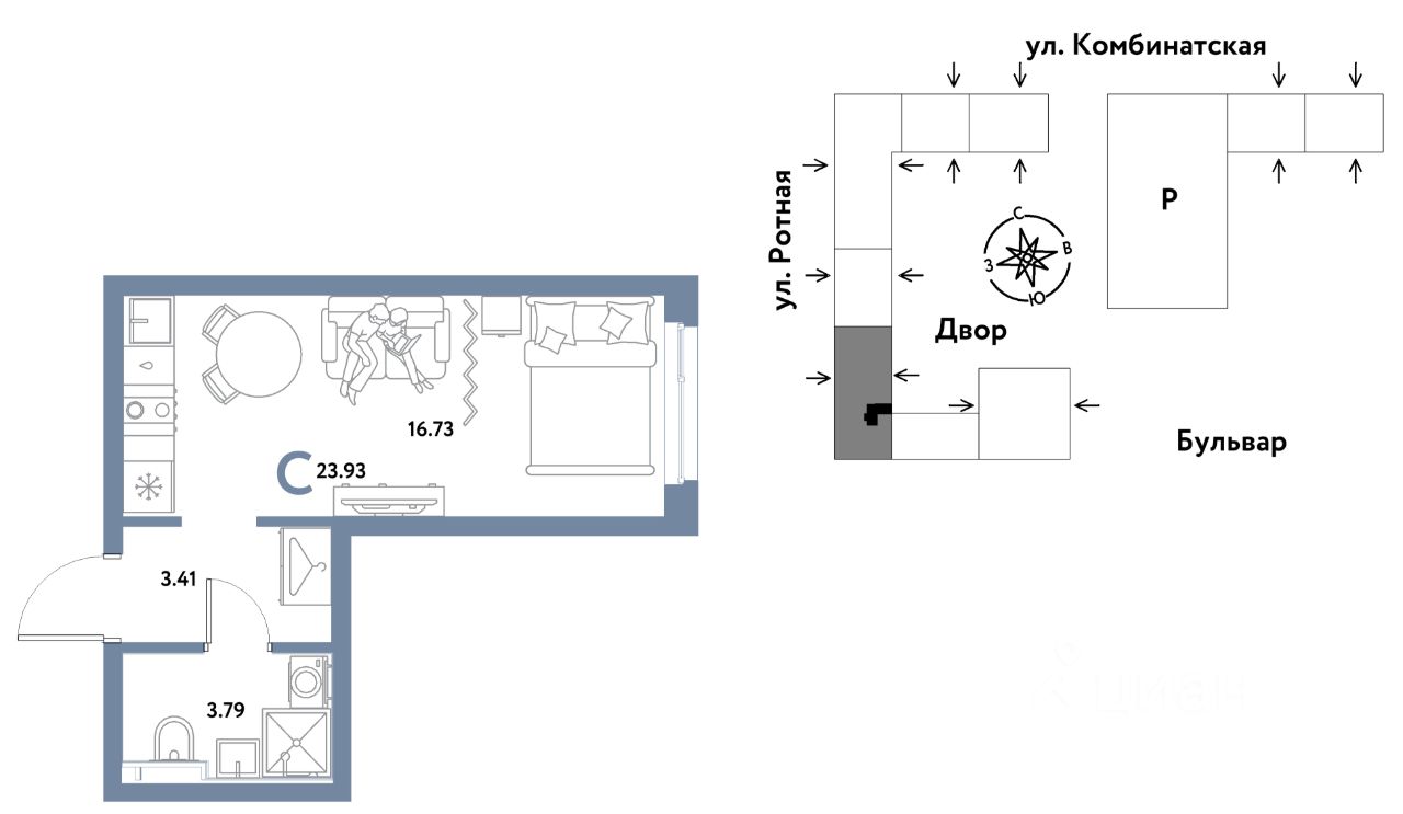 0комнатная квартира площадью 23,93кв. м. на 13 этаже жилого комплекса "Уральский сад".