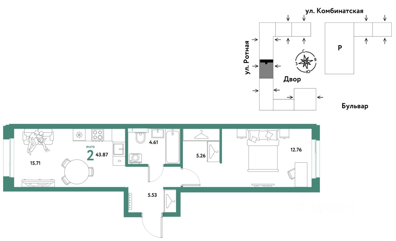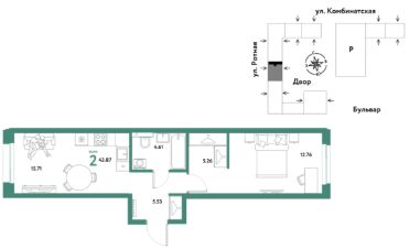 2комнатная квартира площадью 43,87кв. м. на 7 этаже жилого комплекса "Уральский сад".