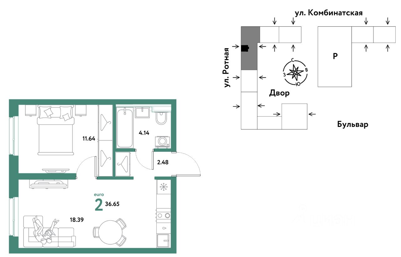 2комнатная квартира площадью 36,65кв. м. на 13 этаже жилого комплекса "Уральский сад".