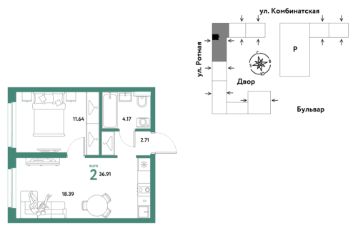 2комнатная квартира площадью 36,91кв. м. на 14 этаже жилого комплекса "Уральский сад".