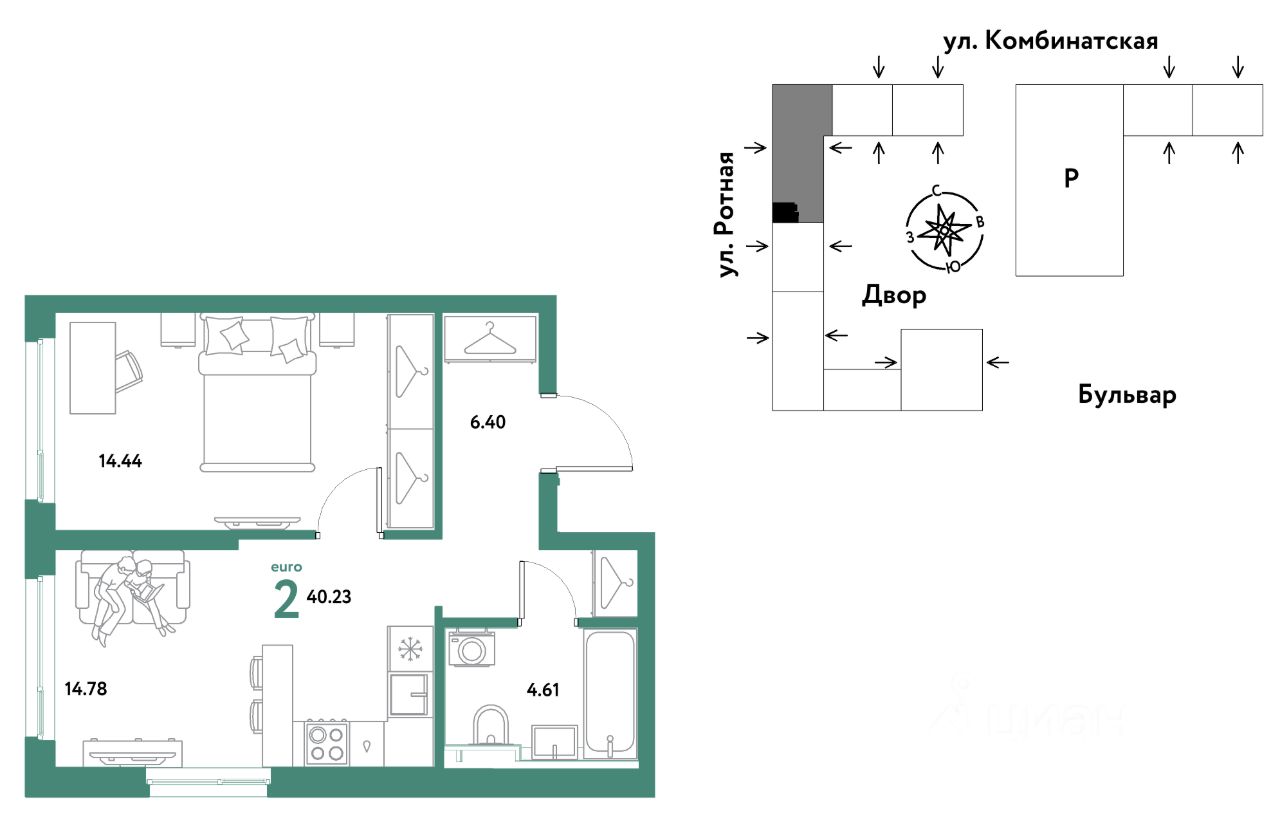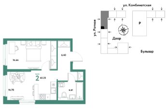 2комнатная квартира площадью 40,23кв. м. на 16 этаже жилого комплекса "Уральский сад".