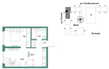 2комнатная квартира площадью 36,91кв. м. на 20 этаже жилого комплекса "Уральский сад".